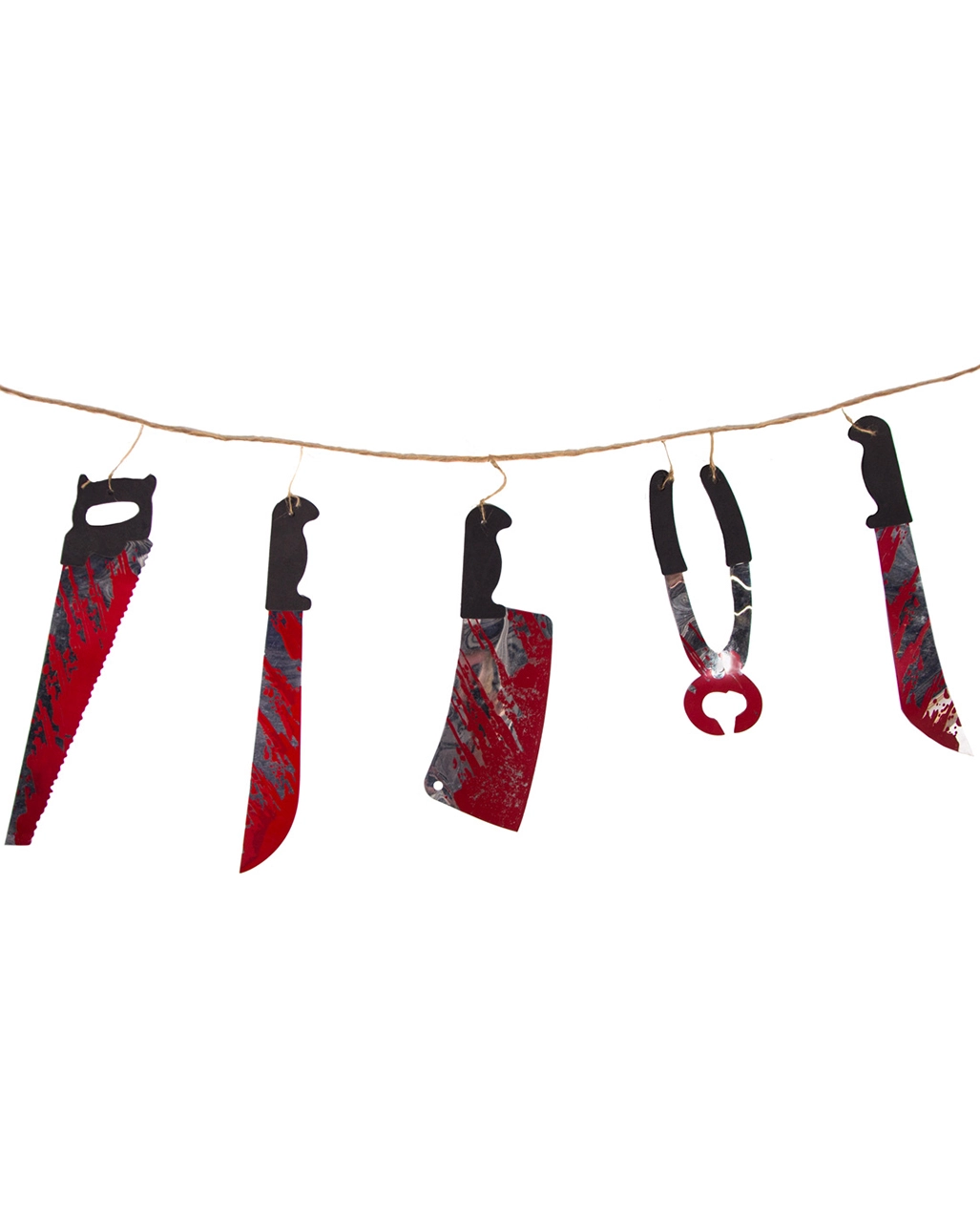 Der heimische Werkzeug und Besteckkasten dient schon in vielen Horrorfilmen dazu Mordwerkzeug auszusuchen und die Bewohner des Hauses ins Jenseits zu befördern. Die Folterwerkzeug Girlande setzt genau hier an und lässt auch Deine eher brave Küche oder das ansonsten kuschlige Wohnzimmer zum blutigen Tatort werden! Der Raum gewinnt schnell an gruseliger atmosphäre wenn Du die blutigen Messer, Sägen und Zangen als Halloweendekoration einsetzt.