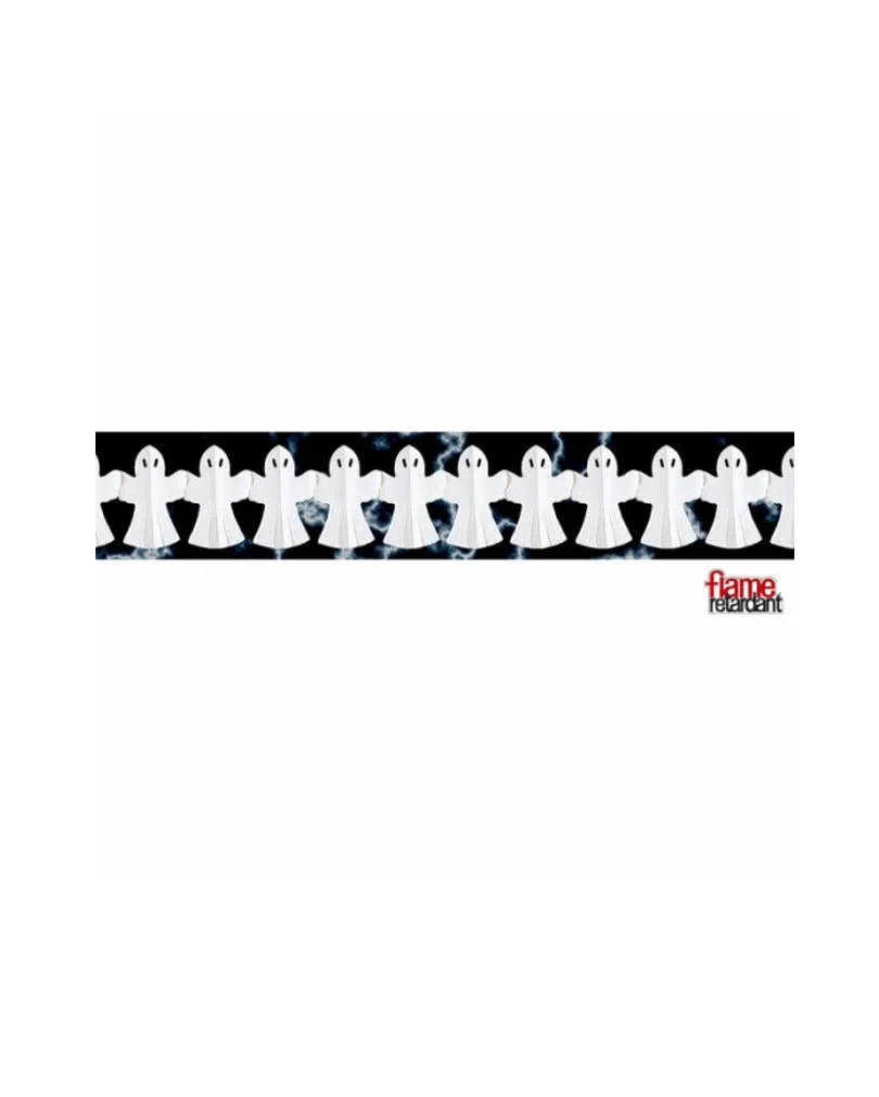 Die schwer entflammbare Geistergirlande aus weißem Seidenpapier zum Aufhängen an der Decke. Die Gespenstergirlande ist ca. 300cm lang, der Geist hat eine Höhe von ca. 25 cm.