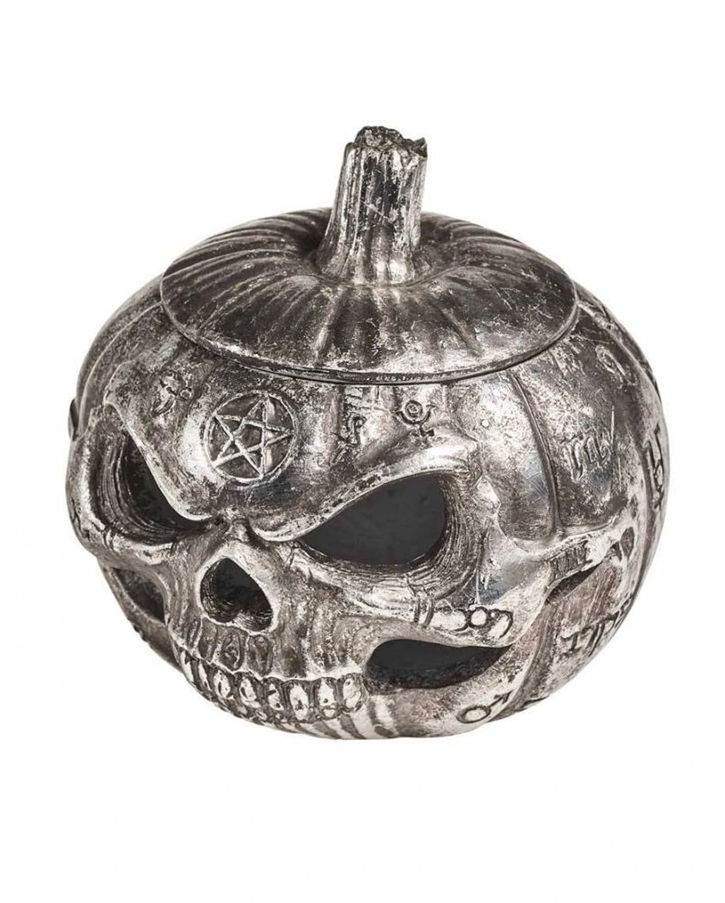 Diese einzigartige Kürbis Totenschädel Schale ist aus hochwertigem Polyresin gefertigt und von Hand bemalt. Nicht nur die schrecklichen Details wie die Zähne, das grimmige Grinsen oder das Pentagramm wirken beeindruckend. Der silbrige Antik-Effekt macht den Totenschädel zum Hingucker. Und natürlich ist das subtile Gothic Design nicht nur zu Halloween eine fantastische Ergänzung für jeden Raum. Warum also nicht ein LED-Licht hinzufügen, um die Kürbis Totenkopf Schale in ein mystisches Nachtlicht zu verwandeln!