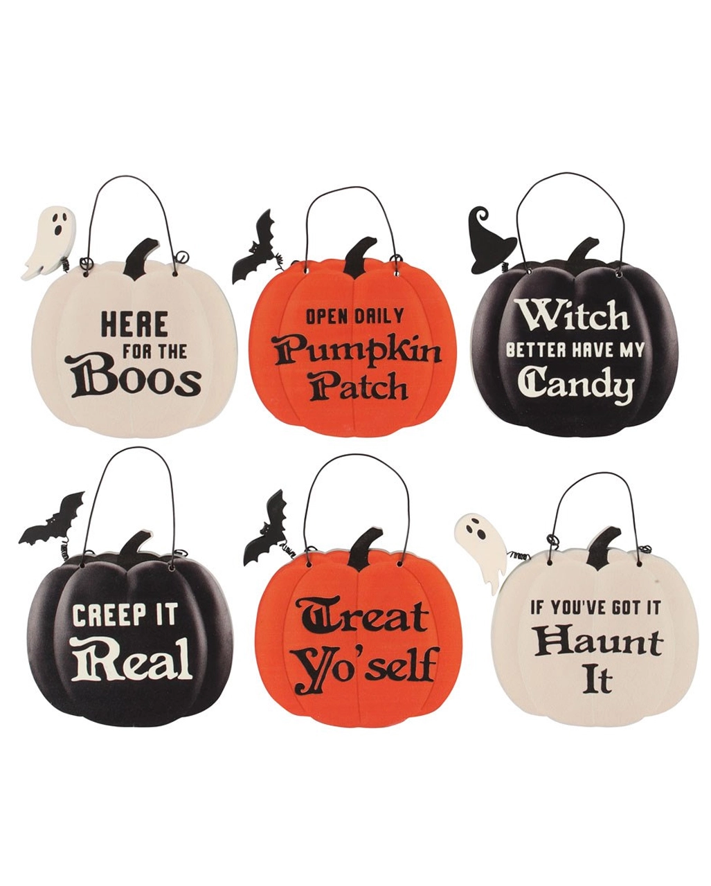 Unser Mini-Kürbis Hängeschild gibt es in sechs einzigartige Designs, die jeweils einen der folgenden Sprüche zeigen: ‚Here for the Boos‘ ‚Open Daily, Pumpkin Patch‘ ‚Witch Better Have My Candy‘ ‚Creep It Real‘ ‚Treat Yo’self‘ ‚If You’ve Got It, Haunt It‘