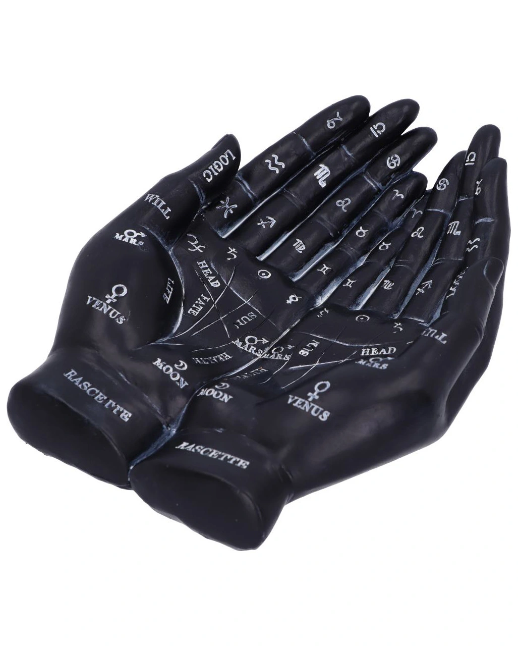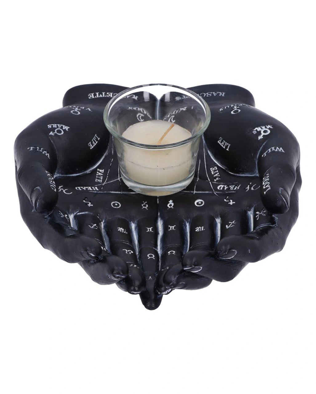 Die Handlesekunst wird auch als Chiromantie bezeichnet und geht davon aus, dass sich die Zukunft eines Menschen in seinen Hände ablesen lässt. Mit diesem Schwarze Chiromantie-Hände Teelichthalter bringst du mystisches Flair in deine vier Wände. Auch als Geschenkidee macht sich der Pagan Teelichthalter ganz hervorragend.